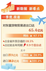 我省对东盟进出口主要呈现以下特点:从国别看,一季度我省对东盟10国进出口值中,印度尼西亚居首位,进出口32.9亿元,占全省对东盟进出口值的50.3%;其次为新加坡,进出口13.5亿元,占全省对东盟进出口值的20.7%;对东盟10国的进出口中有7国实现增长,其中对印度尼西亚和缅甸实现成倍增长。我省对东盟出口机电产品19亿元,同比增长50.2%,占全省对东盟出口值的69.8%。主要进口商品中,铁合金出现大幅增长,各类金属矿及矿砂量减值增,我省自东盟进口铁合金11.5万吨、货值18.9亿元,分别增加14.4倍和增长10.2倍,占全省自东盟进口值的49.3%,全部来自印度尼西亚;进口各类金属矿及矿砂29.6万吨,货值5.8亿元。