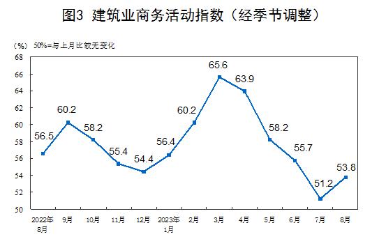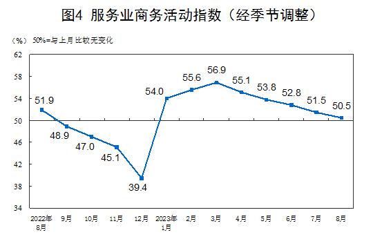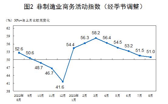 此外,在中国非制造业采购经理指数运行情况方面,8月份,非制造业商务活动指数为51.0%,比上月下降0.5个百分点,仍高于临界点,非制造业持续扩张。