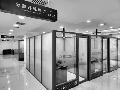 参观完一层大厅后,工作人员将媒体观摩团带到了四层一个全封闭的区域——评标区,随机抽取的专家会在这里进行评标工作。代表们首先是被一系列的科技防范“硬措施”所震撼,人脸识别身份核验机、金属探测门防范冒名顶替,通信设备存储柜、文件传送智能机器人阻断不必要的沟通,轨迹定位卡、电子呼叫系统、电子门牌等技术的应用实现了对交易人员身份类别权限的精准管控……还有全方位、超高清、永久保存的监控设备,实时对外直播的电子大屏,实现了严密管控、处处震慑。