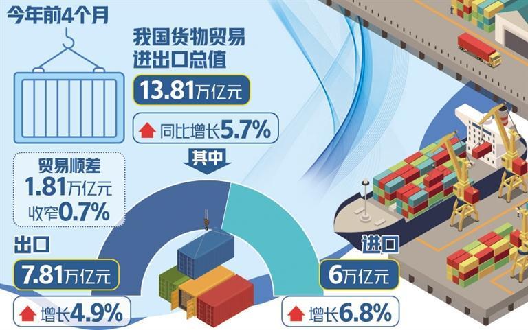 本报北京5月10日讯(记者 顾阳)海关总署日前发布的数据显示,今年前4个月,我国货物贸易进出口总值13.81万亿元,同比增长5.7%,规模创历史同期新高。其中,出口7.81万亿元,增长4.9%;进口6万亿元,增长6.8%;贸易顺差1.81万亿元,收窄0.7%。