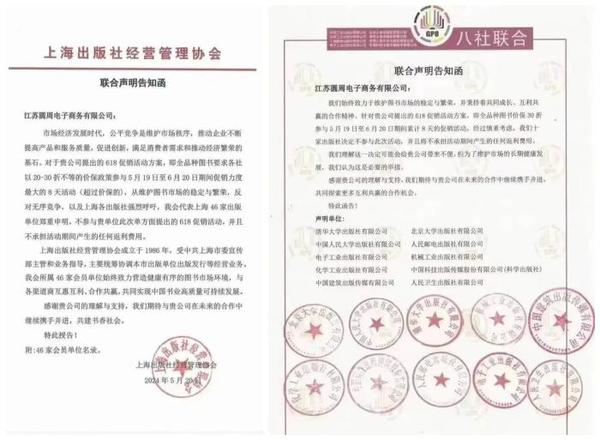 网上流传的两份“联合声明告知函”显示,北京的一些出版社,以及上海出版社经营管理协会代表上海46家出版单位,均声明不参与江苏圆周电子商务有限公司此次提出的618促销活动方案,也不承担活动期间产生的任何返利费用。