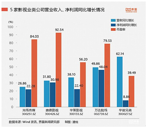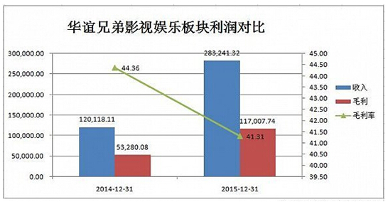 据界面报道,根据财报显示,华谊兄弟2015年影视娱乐版块营业收入较上年同期相比增135.80%,达到28.32亿元,营业成本较上年同期增长135.80%,达到16.62亿,毛利率较上年减少了3.05%,达到41.35%。在报告期内,公司上映的主要是《奔跑吧兄弟》《天将雄师》《栀子花开》、《命中注定》《寻龙诀》《老炮儿》等16部,电影的总票房约43亿。