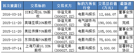 据和讯股票报道,2015年10月22日,华谊兄弟以7.56亿元收购浙江东阳浩瀚影视娱乐有限公司(以下称“东阳浩瀚”)的艺人股东或艺人经纪管理人合计持有的70%股权。主要经营业务包括影视剧项目的投资、制作和发行,艺人衍生品业务的开发和经营,而此次收购所涉及的艺人包括李晨、冯绍峰、Angelababy、郑恺、杜淳、陈赫共6人。