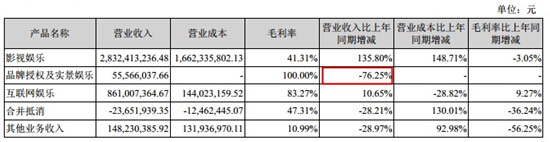据悉,华谊品牌授权与实景娱乐三种主要产品形态包括:华谊兄弟电影小镇、华谊兄弟电影世界和华谊兄弟文化城。2015年报告显示,华谊兄弟品牌授权与实景娱乐板块累计签约项目达 13个。该板块营业收入比上年同期减少了76.25%,王中军号称要做20个项目,但财报上能见到的目前仅有海口观澜湖项目和苏州项目。