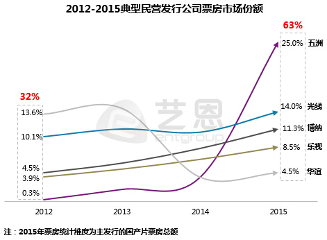 根据艺恩研究报告显示,华谊兄弟从2012年的13.6%的市场份额一路跌至2015年的4.5%,而由万达影视牵头的五洲发行市场份额一路从0.3%飙升至25%,华谊的电影份额被一路碾压。而万达影视也即将以注入上市公司的方式登陆A股市场。