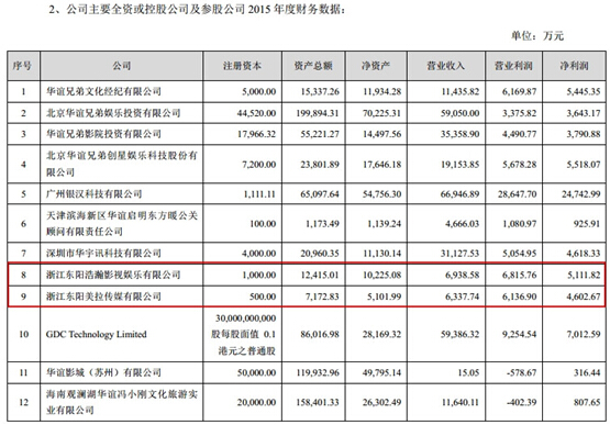 财报显示,经董事会认定浙江东阳浩瀚影视娱乐有限公司2015年度完成净利承诺,其中包括公司在成立期间已经完成的净利润4115.57万元(该部分净利润依据会计准则计入公司的资本公积),以及公司成立之后完成的净利润5111.82万元,合计9227.39万元。