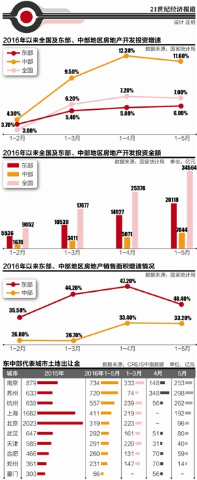 21世纪经济研究院比照数据发现,仅开发投资数据的月度波动并不足见房地产市场的冷热状况,因为这受不同地区的供地节奏影响较大。比如在5月,一些中部热点城市的土地供应明显减少,造成了投资失速的状况。