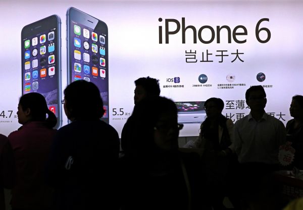 2014年10月17日,顾客在江西南昌的一家苹果授权经销店门口排队,等待购买iPhone6和iPhone6 Plus手机。 (新华社发)