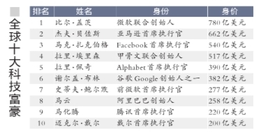 中国内地19位富豪进入这份榜单,包括阿里巴巴马云、腾讯马化腾、百度李彦宏、网易丁磊、小米雷军等均有上榜。其中,阿里巴巴董事局主席马云以258亿美元排名第八,腾讯创始人马化腾以220亿美元排名第九。