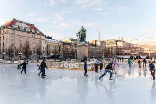 2015年2月6日,人们在瑞典斯德哥尔摩市中心的国王花园溜冰。斯德哥尔摩的冬季常年被白雪覆盖,阳光下的城市显得格外宁静。