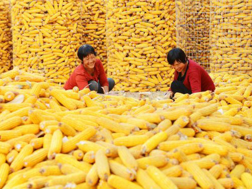 图说:资料图:2015年10月14日,河北省成安县道东堡乡化店村农民在家门口摆放玉米。新华社记者 牟宇 摄