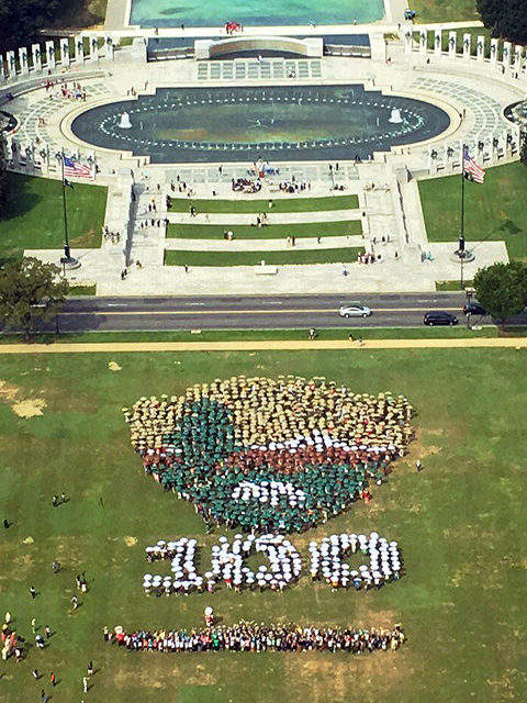 资料图:8月25日,约千名民众聚集在华盛顿纪念碑前的草地上,手举各色雨伞,组成美国国家公园管理局的徽章图案,庆祝美国国家公园管理局成立一百周年。新华社发