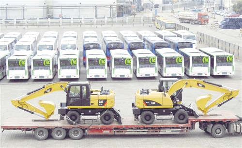 近年来,中国在全球贸易经济中的地位进一步上升,在世贸组织中的作用持续增强,以开放姿态赢得自身经济贸易体量迅速增长。图为客车和工程机械设备在江苏连云港港口码头等待装船。 (新华社发)