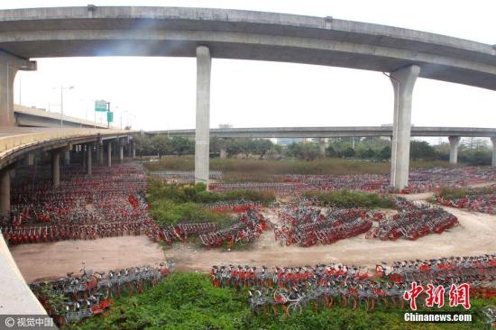 资料图片,广州海珠区新洲立交桥下摆满了共享单车。 马强 摄 图片来源:视觉中国