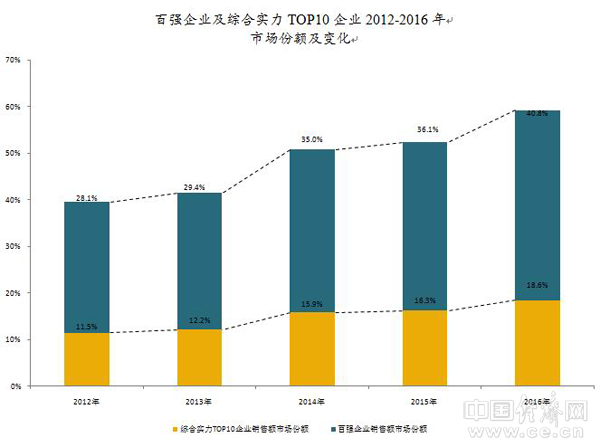 2016年百强企业凭借准确的市场研判、契合主流的市场布局与产品架构,实现新一轮的跨越式发展,销售规模加速提升,市场份额突破四成。销售总额、销售面积分别达48027.1亿元、40251.7万平方米,同比增长52.5%和39.4%。受益于规模和品牌效应的持续扩大,百强企业销售额和销售面积增长率分别高于同期全国增幅17.7、16.9个百分点,行业领先优势进一步彰显。