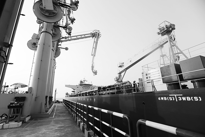 图片说明:10日,缅甸马德岛港,卸油臂从油轮上卸油。