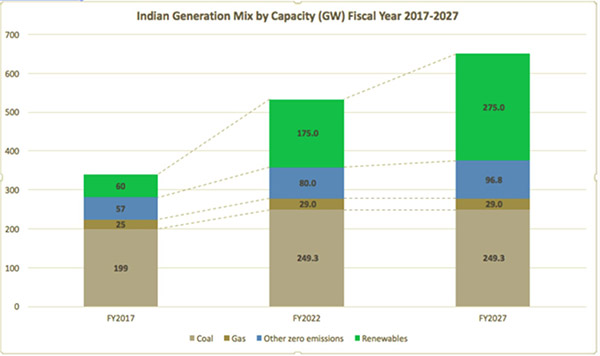 印度在国家自主贡献中承诺,到2030年非化石燃料发电在总装机容量占比将提高至40%。电力规划中的预测则更为乐观——其预计到2022年,非化石燃料发电将占总装机容量的46.8%;到2027年,占比将达56.5%。
