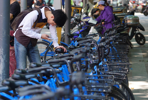 资料图片:一位市民准备利用共享单车出行。新华社记者 季春鹏 摄