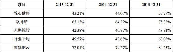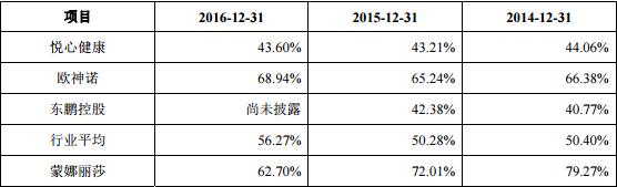 另外,由于去年6月,在香港上市三年的东鹏控股正式从香港退市。因此,东鹏控股2016年资产负债率暂无法对比。另一竞争对手悦心健康2014年至2016年的资产负债率分别为44.06%、43.21%、43.60%,这份数据更是远低于蒙娜丽莎。