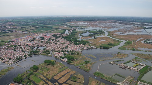 资料图:这是鸟瞰雄安新区安新县境内的白洋淀淀区内的村庄。新华社记者 杨世尧 摄