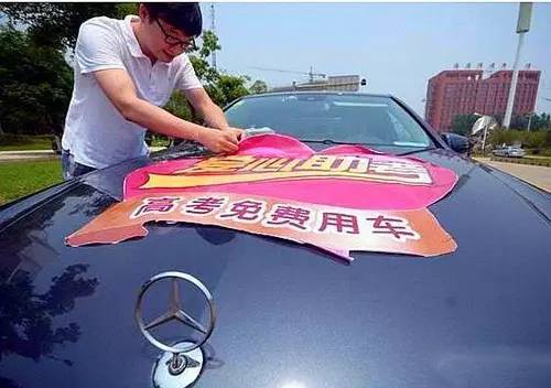 玛莎拉蒂、路虎、奔驰、宝马……等十辆豪车在路边一字排开,每辆车的发动机盖上都贴着“高考免费用车”的标语,尽管低调但车队还是吸引了众人的目光。
