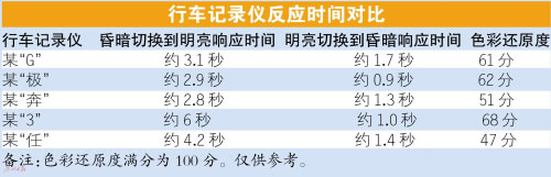 此次测试,车天下君准备一个“黑盒子”,里面放置一个屏幕常亮的智能手机。在“黑盒子”外面,放置另外一个屏幕常亮的智能手机。切换时间控制在0.3秒之内,分为“明到暗”和“暗到明”两个环节,记录行车记录仪场景切换时的响应时间。由测试结果一览表可以看到,参与测试5个型号的行车记录仪的响应时间都不尽相同:短则1秒,长则6秒。车天下君归纳如下,质量合格的行车记录仪从昏暗切换到明亮环境的响应时间应在3~4秒之间,从明亮切换到昏暗环境当中的响应时间应该在1~2秒之内。