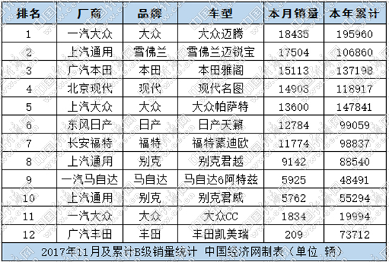 值得一提的是大众CC,作为一款最具个性的B级车,CC稳定在全年2.5万辆销售水平,按照规划,CC全新换代车型将于明年推出,预计下半年上市,而继任车型Arteon已在欧洲上市,起售价接近27万元。从竞争对手分析来看,其实在主流的合资B级车市场,CC没有直接的竞品,相对小众的细分市场,也让它有曲高和寡的味道,新CC的到来,不知能否培养和定义一个新的消费坐标。(记者 黄春棉)