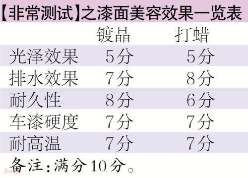 车天下君在两块车身试验面板上进行测试,一块镀晶,一块打蜡。全部按照说明书手工操作。车天下君是个理工男,做这些事情还算是轻车熟路。完工对比光泽效果,在都没有抛光处理的情况下,镀晶和打蜡都没有起到提升漆面光泽的效果,给予“不及格”的差评。泼上水,漆面都形成水珠,但仔细比较,会发现打蜡的排水效果比镀晶要好。