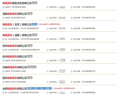 “呱呱洗车”多数地方分公司已处于注销状态。 国家企业信用信息公示系统网站截图