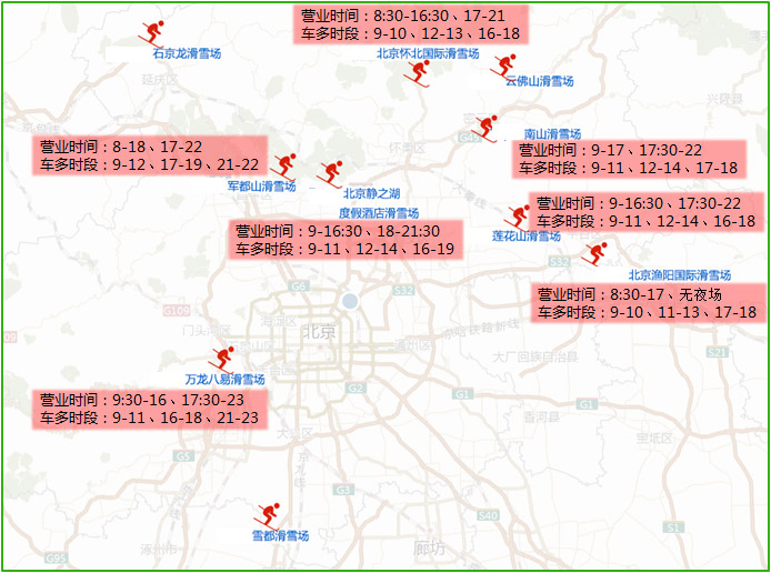 随着冬奥会临近,冰雪运动也在逐年升温。北京周边的南山、军都山、渔阳等滑雪场不管在周末假期还是冬季的其他假期都会吸引大量爱好者。滑雪者多数会选择驾车前往,滑雪场周边道路车流量较大,特别是近城区的几个滑雪场热度较高,9时至10时、12至14时、16至18时三个时段,周边道路的车辆最多,交通压力最大。