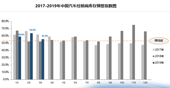 连续两月超越警戒线之后,库存预警指数仍处高位运行。昨日(4月1日),中国汽车流通协会发布数据显示,3月汽车经销商库存预警指数为55.3%,环比下降8.3个百分点,同比上升3.2个百分点,位于警戒线之上。流通协会方面表示,3月市场需求开始恢复,但库存预警指数同比呈上升趋势,仍然处于不景气区间。