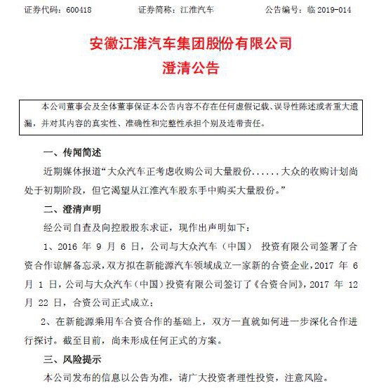 原标题:江淮辟谣大众收购股份传闻,称未形成任何正式方案