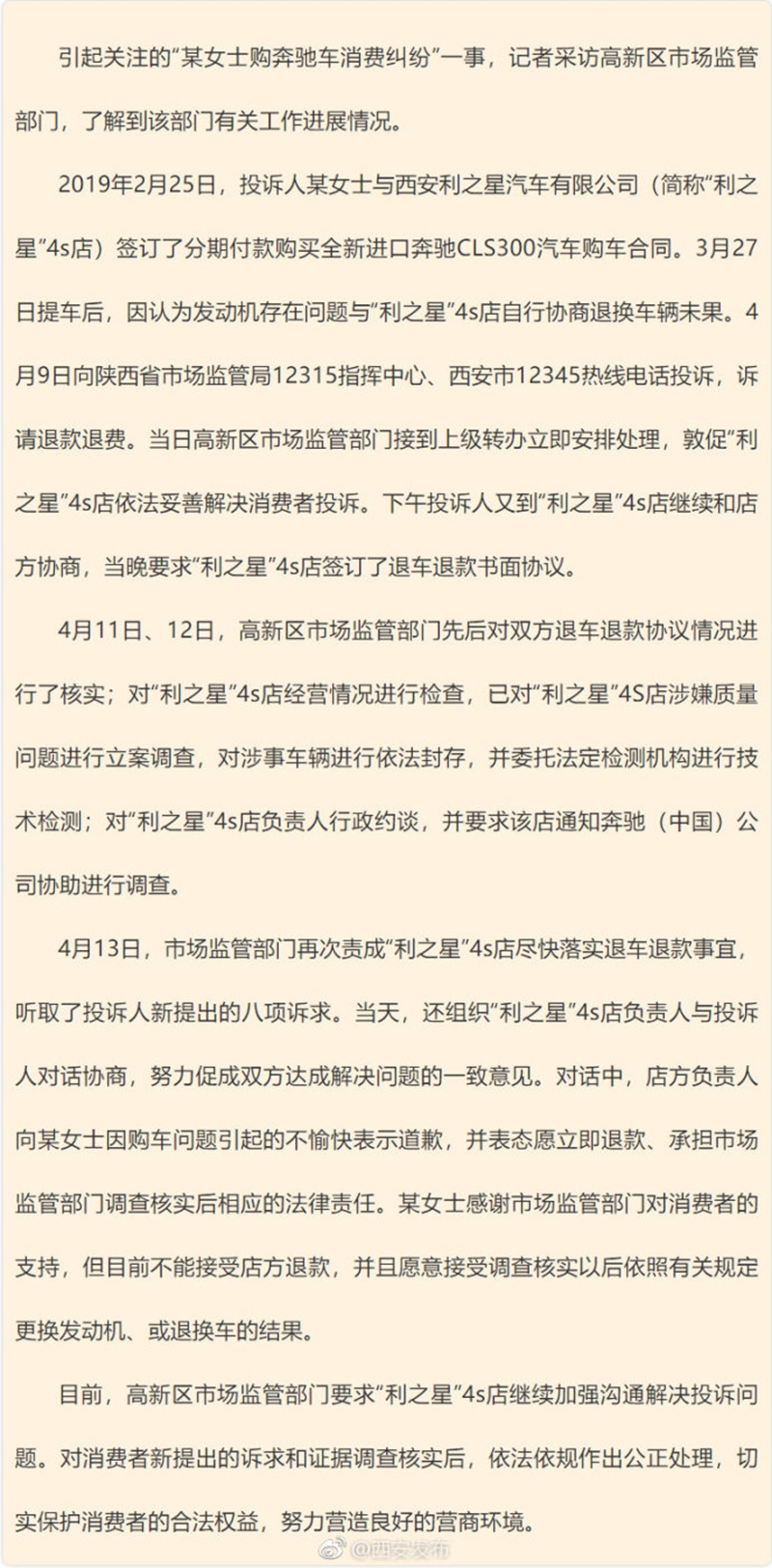 据西安市互联网信息办公室官方微博消息称,4月13日,高新区市场监管部门曾组织利之星4S店负责人与投诉人进行对话协商。对话中,店方负责人向奔驰女车主因购车问题引起的不愉快表示道歉,并表态愿立即退款、承担市场监管部门调查核实后相应的法律责任。该奔驰女车主感谢市场监管部门对消费者的支持,但目前不能接受店方退款,也愿意接受调查核实以后依照有关规定更换发动机、或退换车的结果。