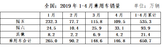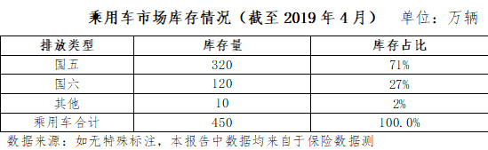 中汽协发布的数据显示, 截至2019年4月份,我国乘用车库销比达3.1,远高于行业1.5的警戒线;行业整体库存约450万辆,国五车辆库存320万辆左右(占行业库存的71%),其中国六提前实施区域的国五车辆库存175-220万辆(调研企业推算得出)。