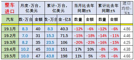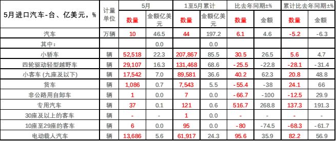 从进口额来看,5月汽车进口额为46.5亿美元,同比增长4.6%;1-5月,汽车进口额为197.2亿美元,同比下降6.3%。
