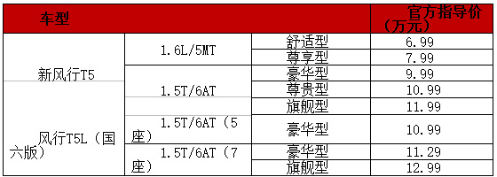 8月18日,东风风行宣布面向全新市场定位的战略车型——“加大号智惠5座SUV”新风行T5正式上市。包括此前预售款型在内,新风行T5共有1.5T/6AT/1.6L/5MT两种动力选择、五款车型,售价从6.99万元到11.99万元,全面覆盖入门级紧凑型SUV市场区间。同时上市的还有风行T5L(国六版)的三款车型,分为5座版和7座版,动力均为1.5T/6AT,售价从10.99万元到12.99万元。