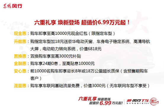 除此之外,为让新风行T5的用户能够享受踏实无忧的购车、用车生活,东风风行贴心准备六重“礼享”,包括现金惠、升舱惠、置换惠、金融惠、安心惠、流量惠等,力度十足。