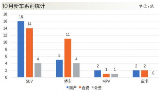 10月合资品牌推出的新车数量超过自主品牌。在轿车领域,合资产品仿佛回到了主场。其中在日系和德系车强势的背景下,韩系车明显加快了投放新品的节奏。据记者统计,轿车中合资品牌共有菲斯塔、宝来纯电等11款新车上市,而自主品牌仅有长安锐程CC等5款新车。一向以SUV市场为主阵地的自主品牌,10月推出长安CS35等16款车型,在SUV新车数量上,自主品牌仅比合资品牌多出两款车型。而外资品牌推出的新车则主要分布在高端车和跑车领域,共有12款新车上市。