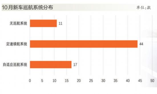 自适应巡航系统在缓解疲劳和保障安全上有明显优势,在10月上市车型中,搭载该系统的新车有17款,如新款东风日产天籁、一汽丰田荣放、长安CS35、WEY VV5、吉利远景X6以及理想ONE等车型,均搭载有自适应巡航系统,甚至是全速自适应巡航系统。与以往相比,自适应巡航技术的渗透率有所提升,而定速巡航的应用则更为广泛,在各级别车型中均有分布。10月,搭载定速巡航的新车总数为44款,而不搭载任何巡航系统的车型共有11款,主要体现在定位较低车型上。