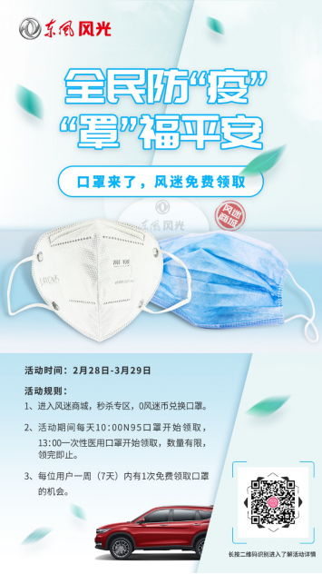 针对疫情期间“一罩难求”的问题,东风小康公司推出了“万只口罩限量免费领取”活动,从现在至3月29日,风迷商城将每天免费送出100份N95、一次性医用口罩,为用户献上专属关爱。