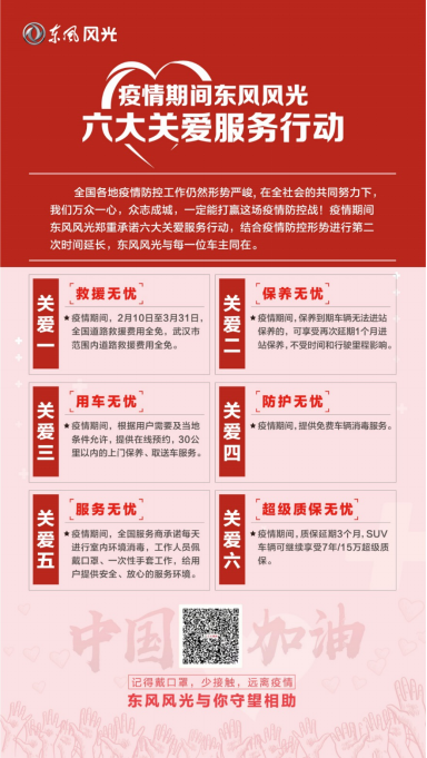 同时,东风小康公司旗下东风风光品牌还针对疫情特别推出“为爱同行,风光助行”购车补贴全套解决方案,用户线上支付99元订车,即可抵扣1000-3000元现金,另享金融贴息至高8000元,低首付、零利息、包牌贷任选,同时置换购车尊享补贴至高10000元。此外,针对东风风光车主,东风风光品牌还推出了包括疫情期间道路救援费用全免、保养延期3个月、提供在线预约、上门保养、取送车服务等六大关爱政策,从救援、延保、用车、服务等全方位为用户提供出行便利及保障。