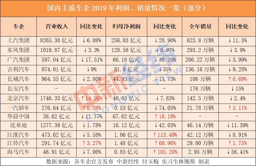 2019年车企成绩单出炉,中新经纬记者经统计发现,营收、净利双降几乎成了各大主流车企的趋势。而少数逆势扭亏为盈者,或因变卖资产、或因收巨额补贴等均非主业所得……梳理得知,市场疲软及销量下滑是车企对全年表现不尽如人意的普遍解释。