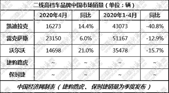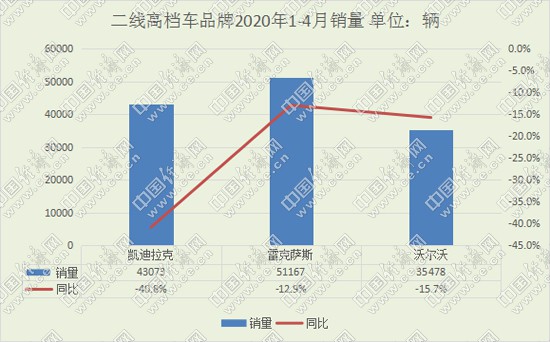 得益于抗疫形势持续向好,复工复产加快推进,4月二线高档车市场呈现加速回升之势。其中,按照月度公布销量的三大品牌,4月均实现同比正增长,凯迪拉克、沃尔沃增幅更是达到两位数,而雷克萨斯也有着6%的上升,为二季度发展奠定良好开局。