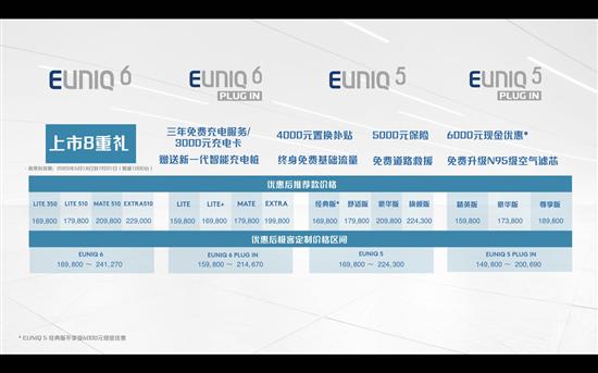 5月18日,上汽MAXUS EUNIQ 5和EUNIQ 6两款车型正式上市,其中EUNIQ 5推出7款车型,售价区间为16.58万-23.03万元,EUNIQ 6共推出8款车型,售价区间为16.58万-23.50万元。新车可通过上汽MAXUS“蜘蛛智选”智能选配平台,选择包括外观饰件、内饰风格、座椅布局等在内的近百种配置。
