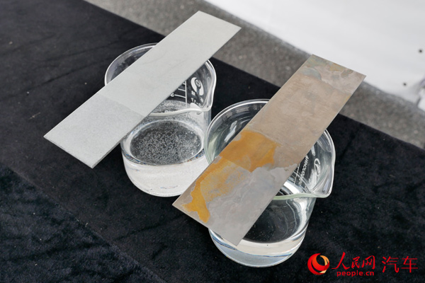 在汽车制造技术中,车身结构在经过焊接成型后,都需要通过电泳池进行镀锌工艺,以防止车身在日后使用环境中被腐蚀,最终得到的“白车身”再进行漆面喷涂工序。记者看到,实验人员将不镀锌钢板和经过镀锌钢板分别放入8%的盐酸溶液中,放置20秒左右,取出用水冲洗,然后静置20分钟,普通钢板表面出现明显红色锈蚀,镀锌钢板表面无明显锈迹。