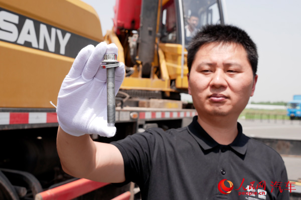 现场,工作人员演示将一颗螺栓从一辆行驶5万公里的实验车上拆下一颗重164克、长112.9毫米的螺栓。随后,将该螺栓作为受力点固定,借助吊机,将重达10吨的房子吊起2米高度,停留5分钟后,螺栓不变形、不磨损。