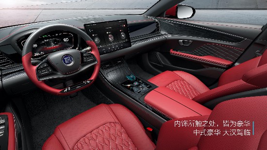 汉整体基于Dragon Face设计语言打造,外观造型采用双龙并型·性能美学设计语言,内饰采用环抱式品格设计语言。内饰设计,左右对称的品字形布局营造出和谐大方的中式豪华内涵。内饰材质工艺、色彩纹理把握有度,Nappa真皮、天然真木、真铝等高级材质恰到好处的使用。
