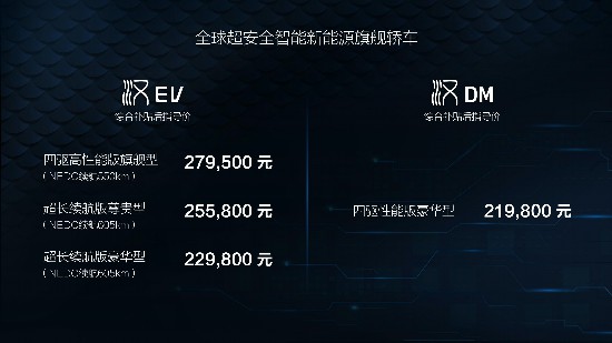 7月12日,比亚迪宣布“全球超安全智能新能源旗舰轿车”汉正式上市,上市车型包含三款汉EV和一款汉DM。全国综合补贴后,汉EV超长续航版豪华型售价22.98万元、汉EV超长续航版尊贵型售价25.58万元、汉EV四驱高性能版旗舰型售价27.95万元;汉DM四驱性能版豪华型售价21.98万元。