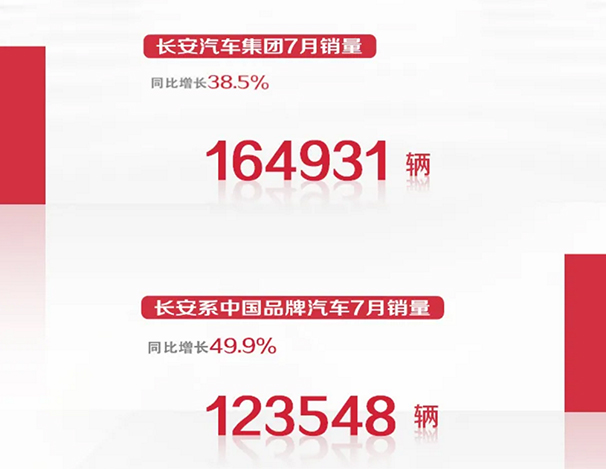 新华网北京8月8日电 8日,长安汽车对外公布的数据显示,2020年7月延续上升势头,长安汽车单月整体销售164931辆,同比增长38.5%。其中,长安系中国品牌汽车7月销量达到123548辆,同比增长达49.9%。