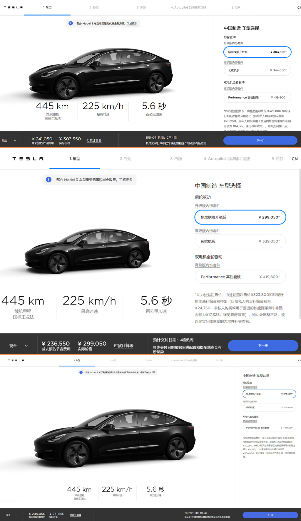 特斯拉Model 3标准续航后驱升级版价格多次调整官网截图。